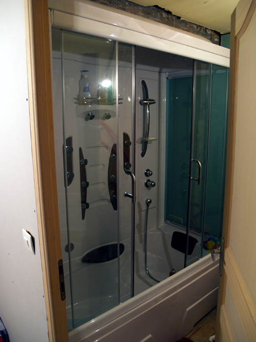 view from hall infront of my bedroom of shower , all one pice fiberglass , kids can nexver get water on the floor again , the doors close shut withh a magnetic seal