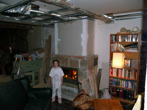 this is after , walls down and floor redone fire place in testing heatin system , box in cieling , the chimine tube is like the picture but 7 meters tall