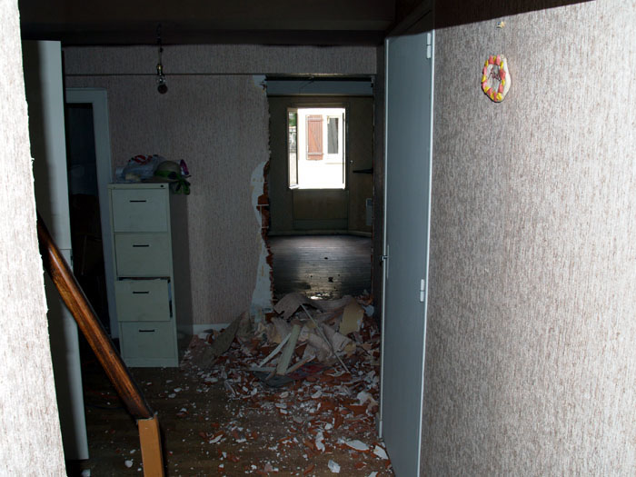 smashed hole in wall of big room