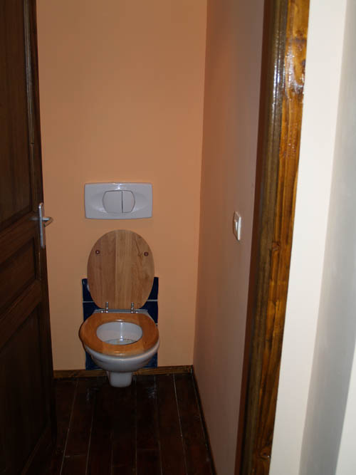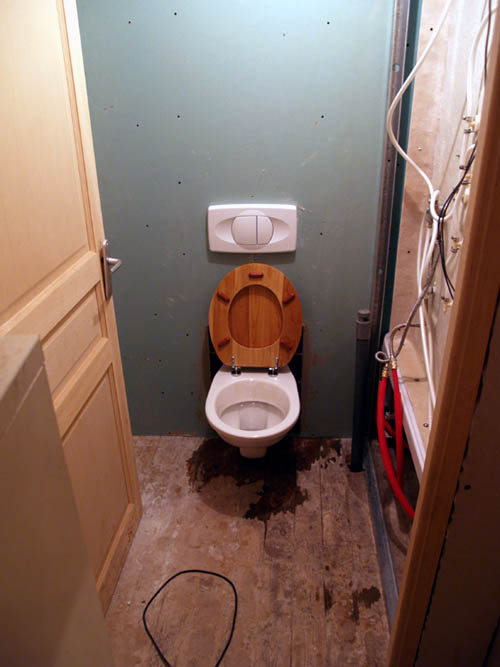 theres the toilet finished to be installed , you can see shower , the back of it anyway , still gotta put up this wall , the hose stickin ourtta the floor ( grey ) is the air intake for the plumbin , put a anti return valve on the end of it ,